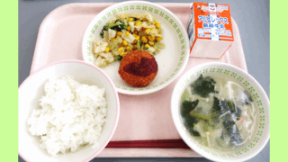 ごはん 上越産大豆いりコロッケ ごまみそサラダ 塩こうじスープ 牛乳 上越市は、米の生産と並んで大豆の生産も盛んです。また、たくさん生産される米や大豆を利用した発酵食品の製造は、とても歴史が深く、地元の食文化として受け継がれています。 この...