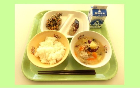 南魚沼市でとれた秋の味覚を使った献立です。ご飯は、南魚沼産の「コシヒカリ」、お汁は、「ぶなしめじ」「さつまいも」「ねぎ」、そして、地元の酒造会社で作られた「甘酒」を使用しました。地域で生産された農産物を地域で消費することを「地産地消」といいます。「地産地消」は農産物等が身近で作られ、輸送等に時間をかけずに使用できるため、新鮮で安心・安全といわれています。南魚沼市では、生産者のみなさんが心を込めて作った地域の食材を、日ごろから積極的に取り入れています。