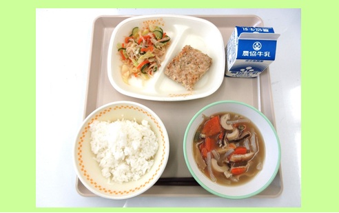 ごはん 鮭の松風焼き 切り干し大根のなますサラダ 柏崎の煮しめ 牛乳