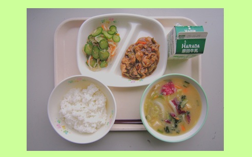 ごはん(三条市産特別栽培米コシヒカリ) 下田ポークと三条市産キャベツのホイコーロー たくあんのおかかあえ 三条地場もん汁 牛乳