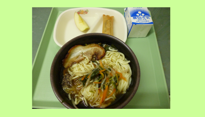 新潟おすすめ給食ブラックラーメン じゃがチーズ春巻き りんご 牛乳