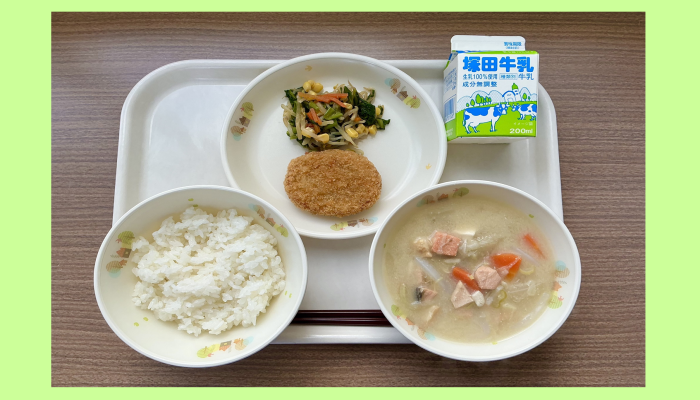 ごはん、梅ふりかけ、さといもコロッケ、女池菜のひたし、鮭の粕汁、牛乳