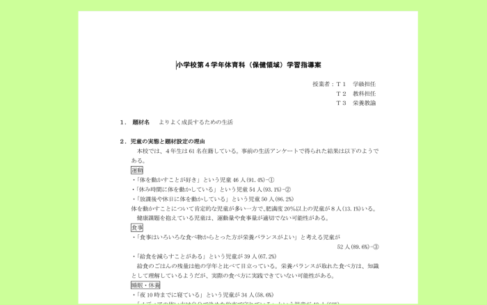 R7年度 中1学級活動「自作弁当の日」に向けて 2026.04.20 R7年度 特別支援高等部2「適塩」を意識した食事の組み合わせを考えよう 2026.04.172026.04.20 R7年度 小6家庭科(保健)「病気の予防」 2026.04.172026.04.20 R7年度 特別支援高等部2特別活動「社会で働けるおとなになるために、栄養バランスのとれた食事を考えよう」 2026.04.172026.04.20 R7年度 中学全学年家庭科 選択 生活の課題と実践 2026.04.172026.04.20 R7年度 小4体育科(保健)「よりよく成長するための生活」 小学校第4学年 2026.04.172026.04.20 R7年度 小学校4年生_体育科(保健)「よりよく成長するための生活」