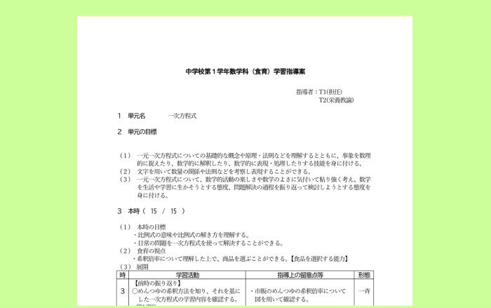 R7年度 中1学級活動「自作弁当の日」に向けて 2026.04.20 R7年度 特別支援高等部2「適塩」を意識した食事の組み合わせを考えよう 2026.04.172026.04.20 R7年度 小6家庭科(保健)「病気の予防」 2026.04.172026.04.20 R7年度 特別支援高等部2特別活動「社会で働けるおとなになるために、栄養バランスのとれた食事を考えよう」 2026.04.172026.04.20 R7年度 中学全学年家庭科 選択 生活の課題と実践 2026.04.172026.04.20 R7年度 中1数学「一次方程式」 中学校第1学年 2026.04.172026.04.20 R7年度 中学校1年生_数学「一次方程式」