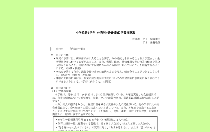 R7年度 中1学級活動「自作弁当の日」に向けて 2026.04.20 R7年度 特別支援高等部2「適塩」を意識した食事の組み合わせを考えよう 2026.04.172026.04.20 R7年度 小6家庭科(保健)「病気の予防」 2026.04.172026.04.20 R7年度 特別支援高等部2特別活動「社会で働けるおとなになるために、栄養バランスのとれた食事を考えよう」 2026.04.172026.04.20 R7年度 中学全学年家庭科 選択 生活の課題と実践 2026.04.172026.04.20 R7年度 小6家庭科(保健)「病気の予防」 小学校第6学年 2026.04.172026.04.20 R7年度小学校6年生_体育科(保健)「病気の予防」