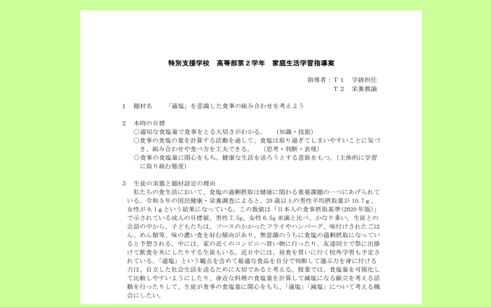 R7年度 中1学級活動「自作弁当の日」に向けて 2026.04.20 R7年度 特別支援高等部2「適塩」を意識した食事の組み合わせを考えよう 2026.04.172026.04.20 R7年度 小6家庭科(保健)「病気の予防」 2026.04.172026.04.20 R7年度 特別支援高等部2特別活動「社会で働けるおとなになるために、栄養バランスのとれた食事を考えよう」 2026.04.172026.04.20 R7年度 中学全学年家庭科 選択 生活の課題と実践 2026.04.172026.04.20 R7年度 特別支援高等部2「適塩」を意識した食事の組み合わせを考えよう 授業研修 2026.04.172026.04.20 R7年度 特別支援学校_高等部2年生_家庭生活「「適塩」を意識した食事の組み合わせを考えよう」